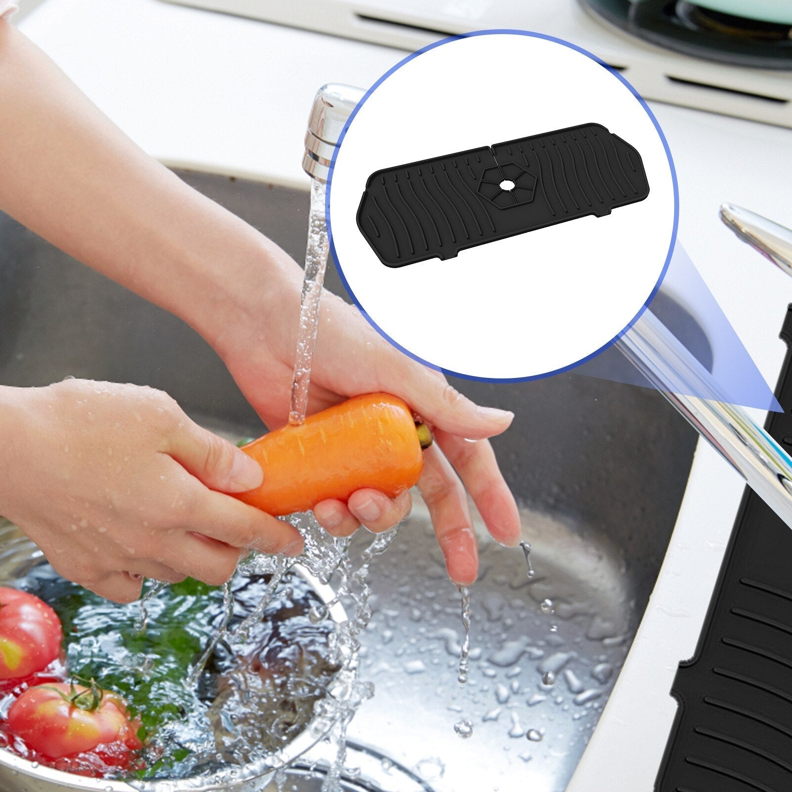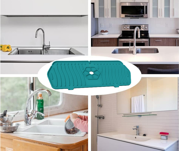 Probeer nu de siliconen watervanger™. Deze flexibele, stevige mat blijft goed liggen loopt goed af en houd het aanrechtblad droog en schoon.